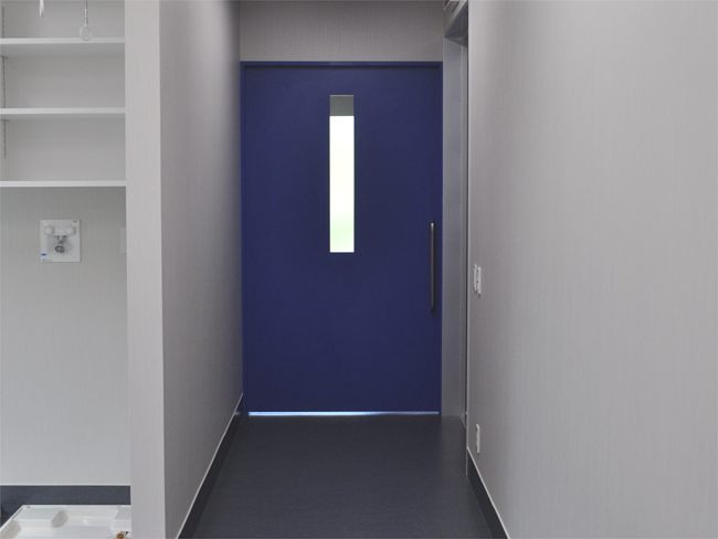 白の清潔感ある空間の中に青のドアがアクセントとなって空間をひきしめています。