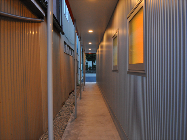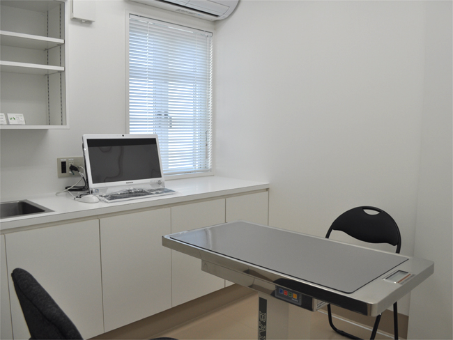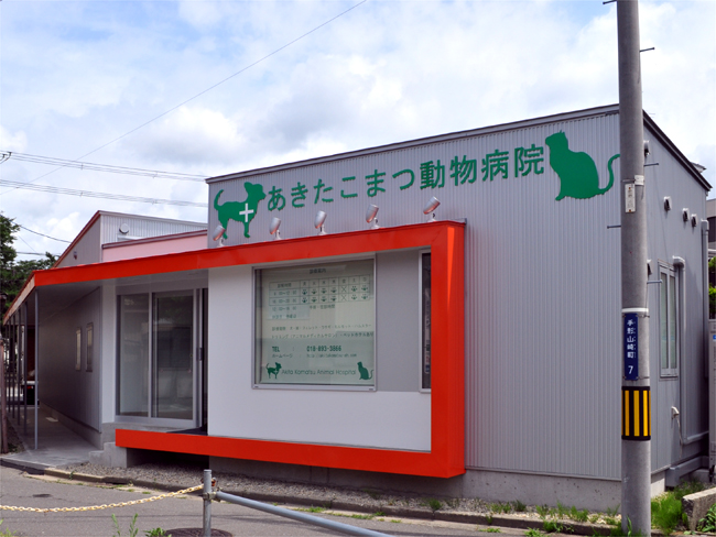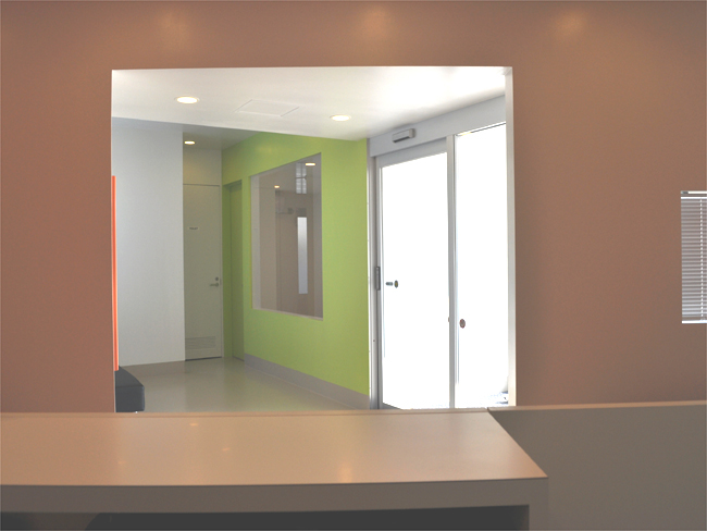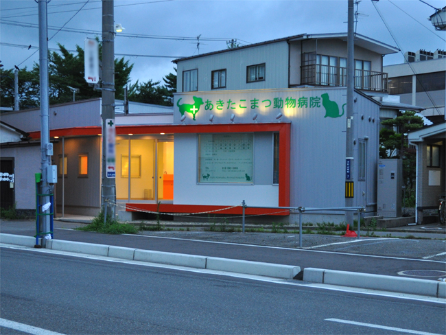 こちらの計画は、獣医師であるお施主さんご夫婦のそんな想いがかたちになった動物病院です。ここでは地域に密着した動物医療とお客様への丁寧なサービスをモットーとした病院の考えをいかに具現化してゆくかをテーマに設計を行いました。台形敷地を生かしたT字型の待合室は、それぞれの待合部分がゆるやかにつながった快適な空間となっています。シルバーの建物、病院のコンセプトカラーを使ったオレンジ色の庇とグリーン色のサインは、病院の清潔感とシンプルで親しみのある雰囲気をあわせもった外観となっています。そしてトリミング室の大きな窓は、外に向けて内部の様子を発信することで、地域と病院との距離感を近づける役割を果たしています。
