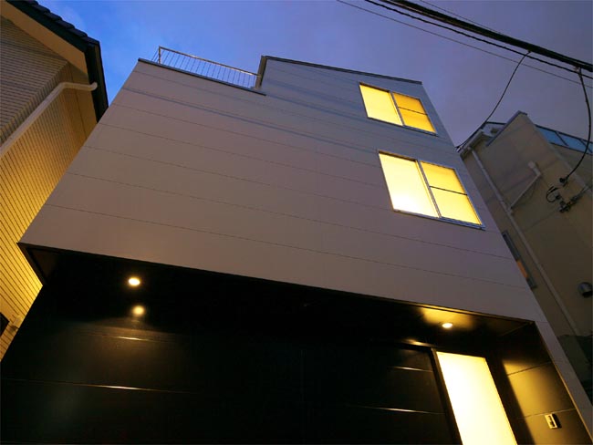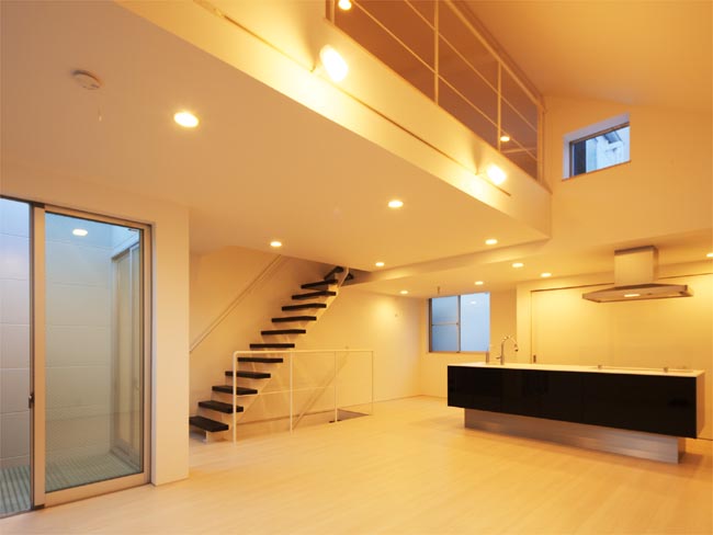 こちらの計画は、そんなお施主さんご夫婦の想いが実現した建築面積13坪の都市型住宅です。こちらでは、コンパクトで制限された敷地の中でいかに広さを感じさせるリビングをつくるかをテーマに家づくりを行いました。