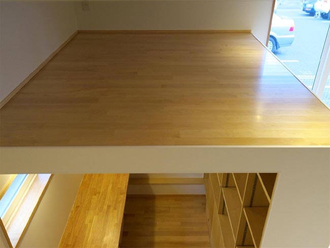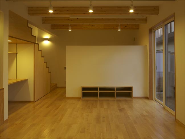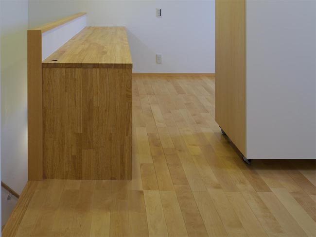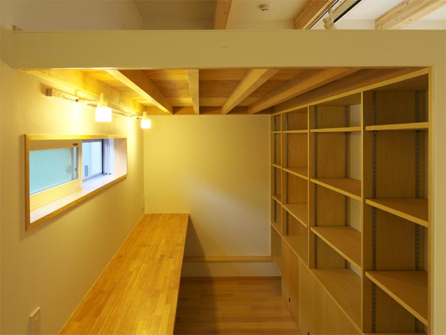1階のLDKは、敷地の長さを最大限活用した開放的な空間としました。梁は現しとすることで天井高さを確保するとともに、木のぬくもりを感じる空間を演出しています。ご主人の趣味スペースである書斎は、天井高さを低めにおさえたこもれる空間としています。こうすることで上部のロフトがLDK空間に奥行きをつくり、視覚的な広さを与えています。また奥様のスペースにはセミオープン型のキッチン、そしてそのうしろには大きなパントリーをもうけています。こちらは十分な収納量が確保できる奥様のご希望がかなった空間となっています。ご家族それぞれの好きなことが、ひとつにつながる空間となってライフスタイルをつくりあげています。